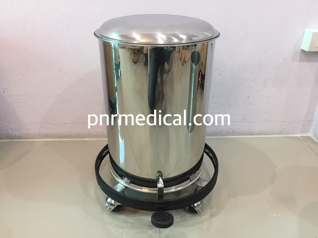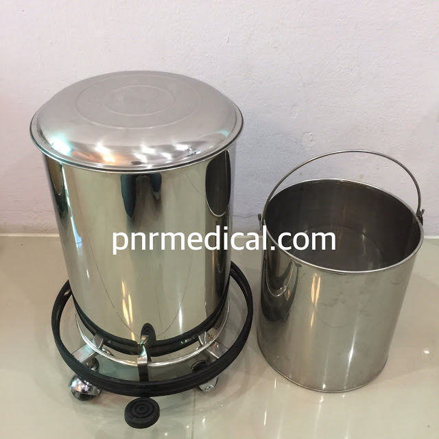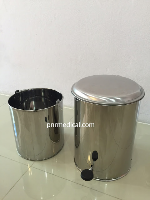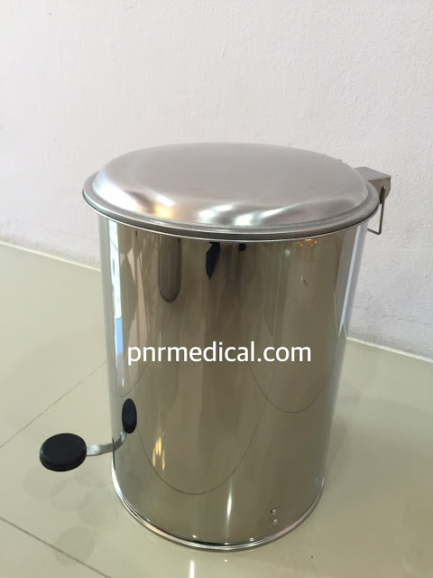 ถังขยะสเตนเลสทรงกลมใส่ขยะติดเชื้อ รูปทรงกลม มีเท้าเหยียบสำหรับเปิดปิด มีถังใส่ภายใน มีล้อและกันชน ตามมาตราฐานครุภัณฑ์ที่ใช้งานในสถานพยาบาล โรงพยาบาลและคลีนิค ถูกออกแบบและมีการใช้งานมาตั้งแต่อดีตถึงปัจจุบันที่ยาวนานหลายสิบปีมาแล้ว