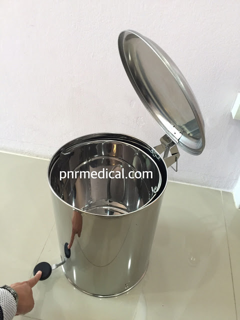 ถังขยะสเตนเลสทรงกลมเปิดด้วยเท้าเหยียบ จะถูกออกแบบให้มีกลไกเท้าเหยียบ เพื่อความสะดวกของเจ้าหน้าที่แพทย์และพยาบาล ในการใช้เท่้าเหยียบเพื่อ เปิด-ปิด เป็นการป้องกันมือสัมผัสกับเชื้อโรคและสารเคมีโดยตรง ภายในจะมีถังขยะทรงกลมอีกชั้นหนึ่ง สามารถหิ้วยกออกนำขยะออกไปทิ้งได้ (แนะนำให้ใส่ถุงขยะพลาสติกสำหรับขยะติดเชื้ออีกชั้นหนึ่ง) ฐานจะมีกันชนหุ้มยางและล้อ4ล้อ สำหรับขยับเคลื่อนย้ายบริเวณของงานได้ด้วย ถังขยะสเตนเลสทรงกลมเปิดด้วยเท้าเหยียบที่ได้มาตราฐานจะต้องผลิตด้วยวัสดุสเตนเลสคุณภาพดี ทนทานต่อสารเคมีและสภาพภูมิอากาศ หนึ่งในนั้นคือไม่ควรจะต่ำกว่าเกรด304
